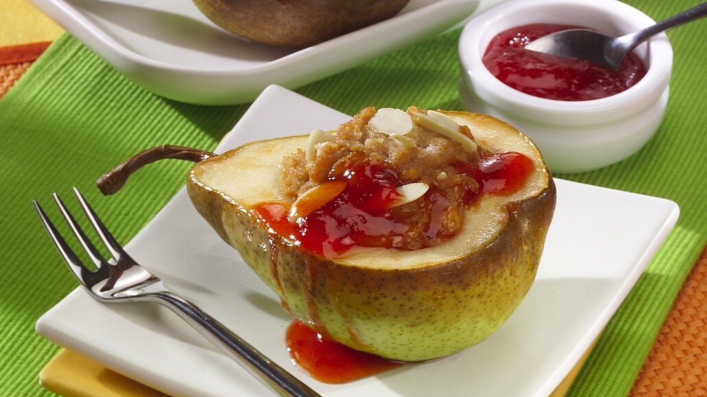 - V malém kastrůlku zahřejeme višňovou marmeládu, přidáme 4 polévkové lžíce vody a krátce povaříme. Upečené hrušky podáváme na talířku přelité višňovou omáčkou.