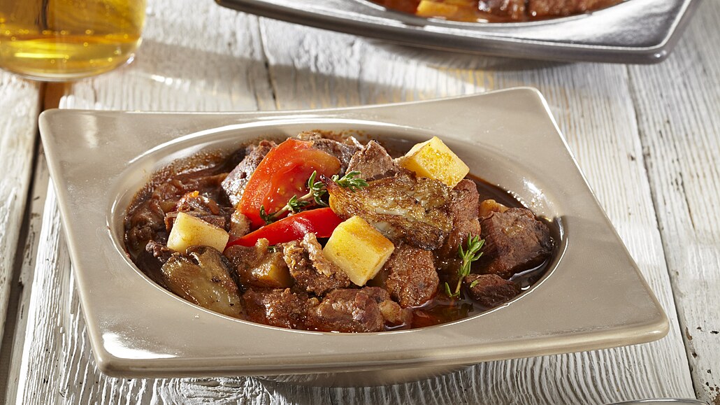 - Když je maso téměř měkké, přidáme do kastrolu brambory s houbami a paprikou. Vše dovaříme doměkka. Až ke konci přidáme rajčata. Guláš dochutíme solí, pepřem, popřípadě kořenicí směsí a odstavíme.
