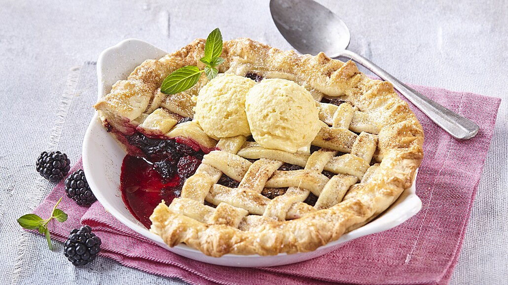 Neodolatelný ovocný páj s tradiční mřížkou. Voňavá náplň z ostružin pod křupavým těstem se skořicí chutná nejlépe s kopečkem vanilkové zmrzliny.