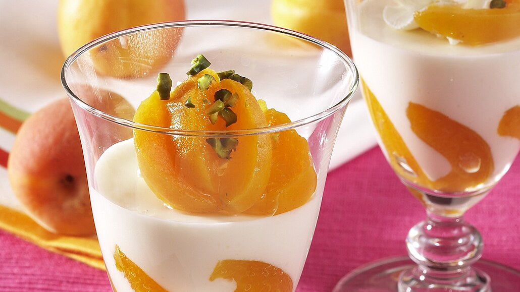 - Meruňky necháme okapat a rozkrájíme na tenké plátky. Část odložíme na ozdobení a zbylými vyložíme 4 dezertní poháry. 150 ml smetany vyšleháme dotuha a šlehačku lehce vmícháme do téměř ztuhlého podmáslí. Podmáslí rozdělíme na meruňky v pohárech, uložíme do chladničky a necháme ztuhnout (alespoň 4 hodiny, nejlépe však přes noc).