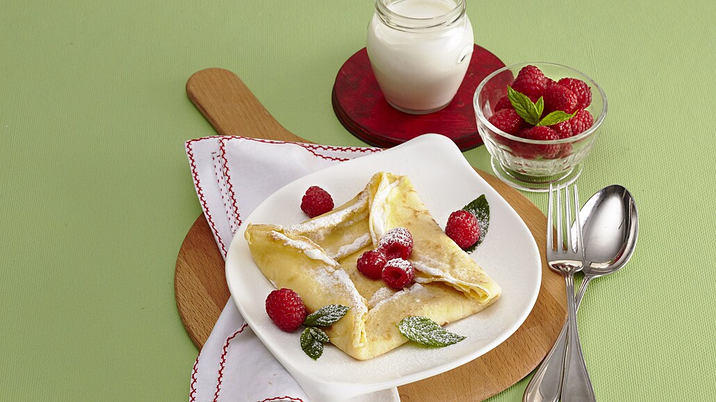- Pánev vytřeme olejem a rozehřejeme ho. Postupně upečeme palačinky z obou stran dozlatova. Pak je potřeme tvarohem a přehneme do tvaru obálky. Podáváme je posypané moučkovým cukrem, doplněné ovocem.