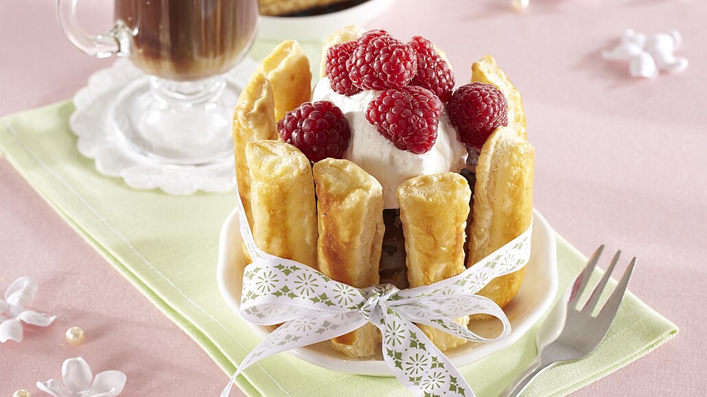 - Hotový pudink rozlijeme do tvořítek, které vypláchneme studenou vodou a dáme do chladničky ztuhnout. Po ztuhnutí vyklopíme na talířky a okolo naskládáme upečené tyčinky z těsta. V polovině je převážeme svážeme stužkou.