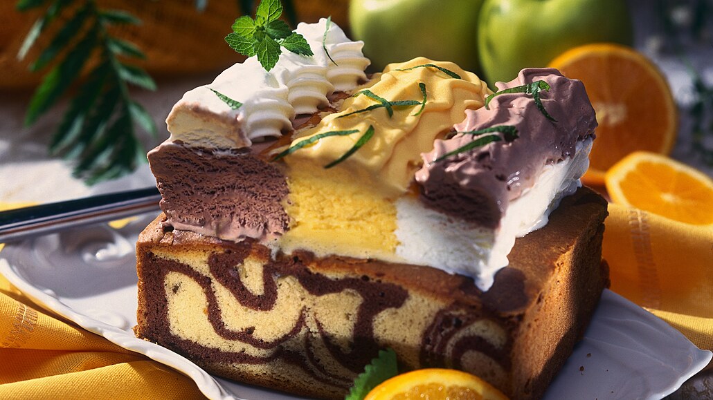 - Těsně před podáváním vyndáme z mrazničky polárkový dort, položíme jej na upečený korpus a rozkrájíme na jednotlivé porce. Ozdobíme lístky meduňky.