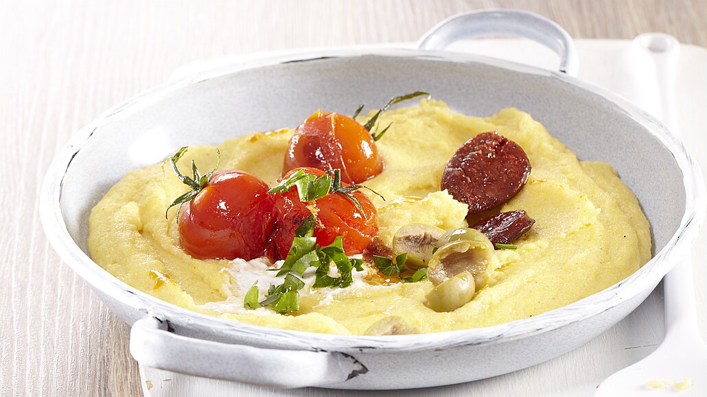 - K opečené klobáse a olivám přidáme polentu a promícháme. Na povrch polenty rozprostřeme natrhanou mozzarellu a rajčata.