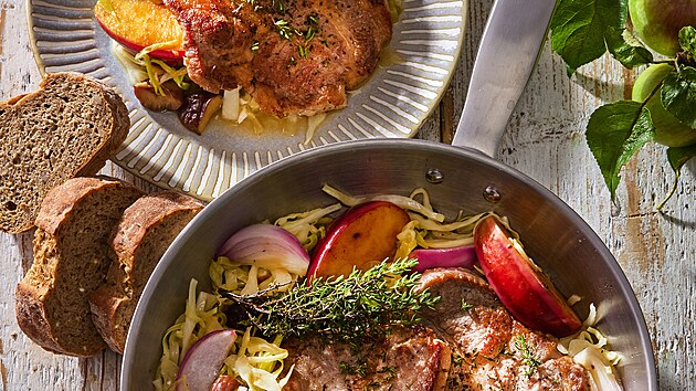 - Mezitím v pánvi na zbylém tuku zprudka opečeme maso z obou stran, aby se zatáhlo, potřeme ho lžící džemu a ještě krátce opékáme. Následně maso položíme na zelí a posypeme zbyly´m tymiánem.