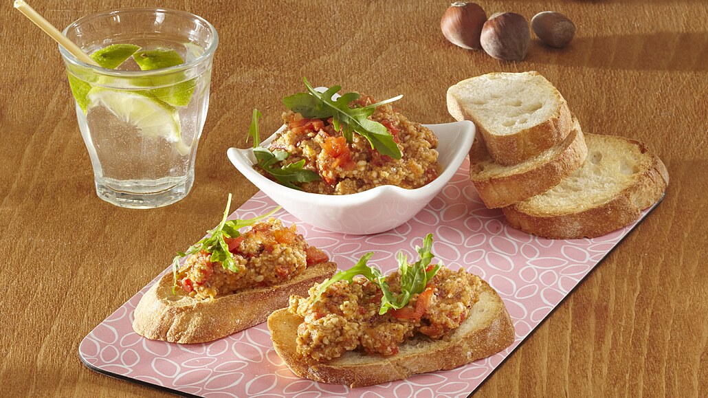 - Paprikovou hmotu promícháme s jemně mletými oříšky a ochutíme mletou sladkou paprikou, solí, pepřem a najemno nasekanou bazalkou.