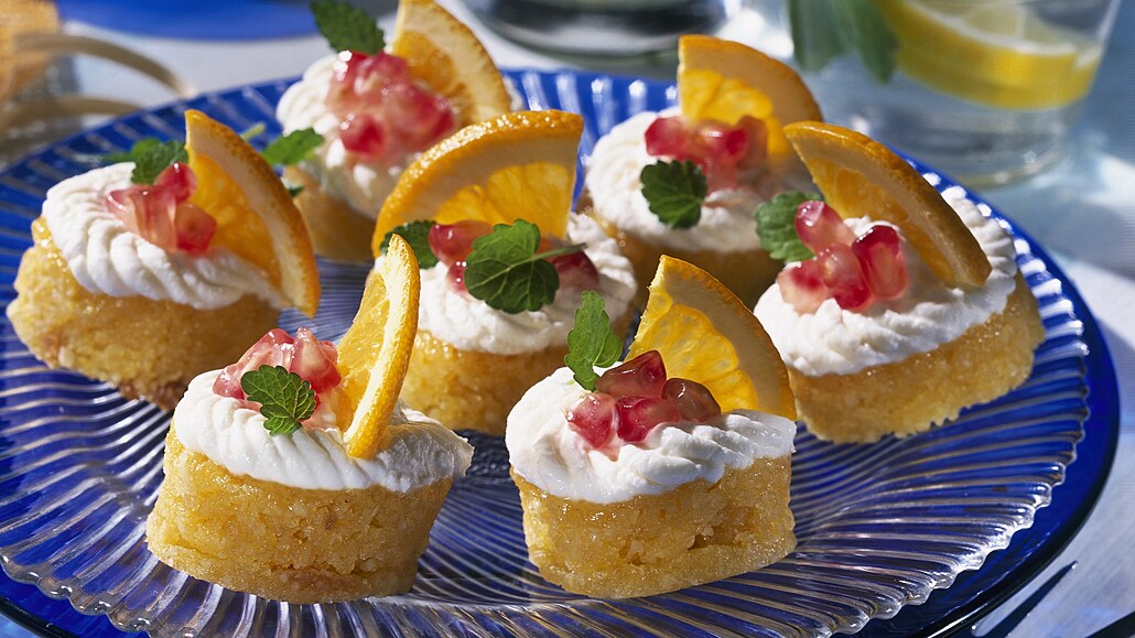- Z korpusu vykrájíme kolečka. Na každý stříkneme trochu lučiny, ozdobíme čtvrtkou plátku pomeranče, několika semínky granátového jablka a mátou.