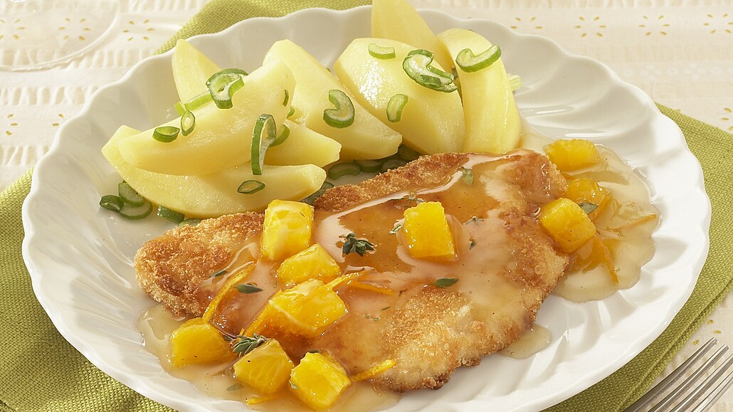 - Opečené řízky přendáme do pekáčku, přelijeme je zbylou marinádou a posypeme kousky oloupaného a nakrájeného pomeranče. V předehřáté troubě dopečeme řízky při 180 °C asi 15 minut. Podáváme s vařeným bramborem. Vše přelijeme medovým výpekem s pomeranči.