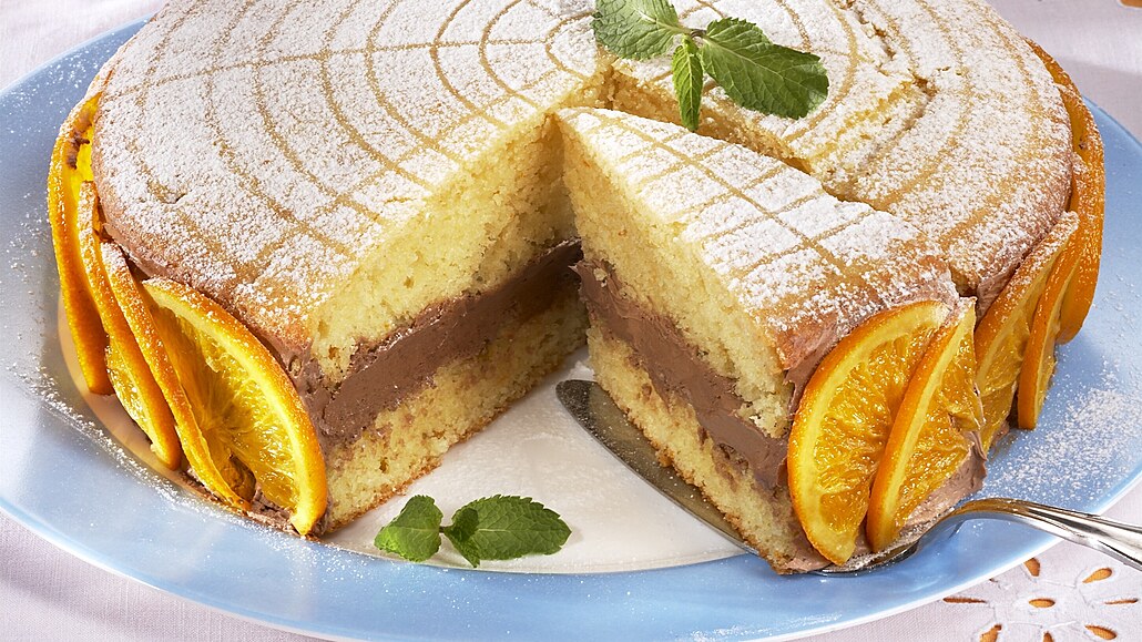 - Upečený korpus necháme krátce zchladnout ve formě. Poté ho vyklopíme na kovovou mřížku. Když vychladne úplně, vodorovně ho prokrojíme. Naplníme ho asi 2/3 krému a sesadíme. Dort potřeme po obvodu zbylým krémem a dozdobíme pomeranči. Navrch ho poprášíme moučkovým cukrem.