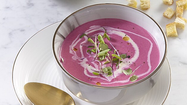 - Přivedeme k varu, osolíme, opepříme a vaříme 10 minut. Pak vmícháme červenou řepu, 5 minut povaříme a rozmixujeme.