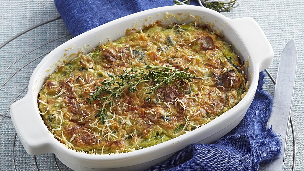 - Hmotu dáme do formy vyložené pečicím papírem, posypeme zbylým sýrem a pečeme v troubě vyhřáté na 170 °C asi 45 minut.