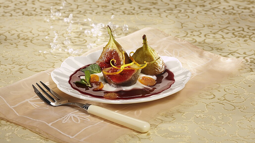 - Vinnou omáčku nalijeme na talíře, doprostřed dáme po lžíci krému a něj rozdělíme rozpůlené fíky. Dozdobíme čerstvým ovocem a lístky máty.