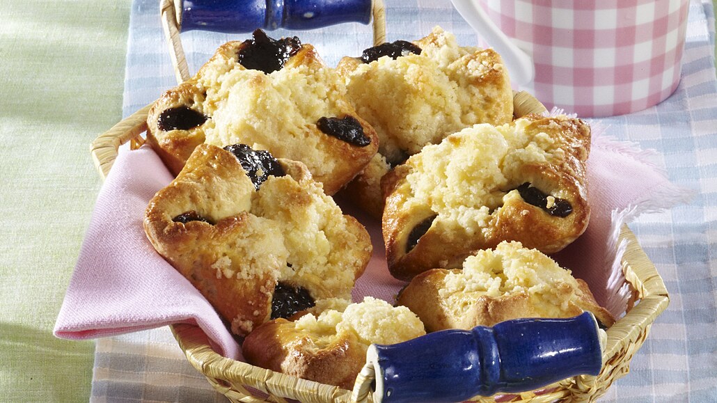 - Cípy každého čtverečku přeložíme směrem ke středu přes náplň a spojíme je. Šátečky rozložíme na plech vyložený pečicím papírem a potřeme je rozšlehaným bílkem. Posypeme je drobenkou a vložíme do předehřáté trouby. Při 180 °C je pečeme asi 20 minut.