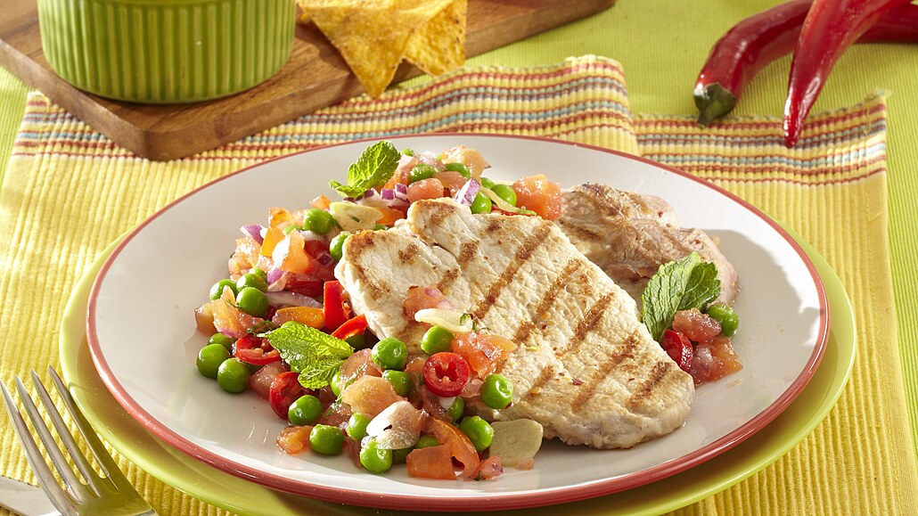 - Cibuli s česnekem oloupeme. Cibuli nakrájíme nadrobno a přidáme k rajčatům. Česnek s chilli papričkou nasekáme a orestujeme na oleji na pánvi. Přidáme rozmrazený hrášek. Vše osolíme, opepříme, dochutíme kmínem, prohřejeme a přidáme k rajčatům. Směs dochutíme limetkovou šťávou a vmícháme do ní mátu. Salsu necháme vychladit.
