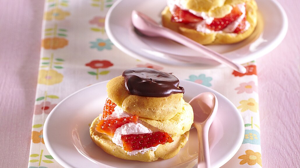 - Smetanu vyšleháme s cukrem a ztužovačem na pevnou šlehačku. Přidáme 50 g rozmixovaných jahod a promícháme. Profiterolky po vychladnutí rozkrojíme. Na spodní díl dáme lžící náplň, ozdobíme kousky jahod a přiklopíme horním dílem korpusu.