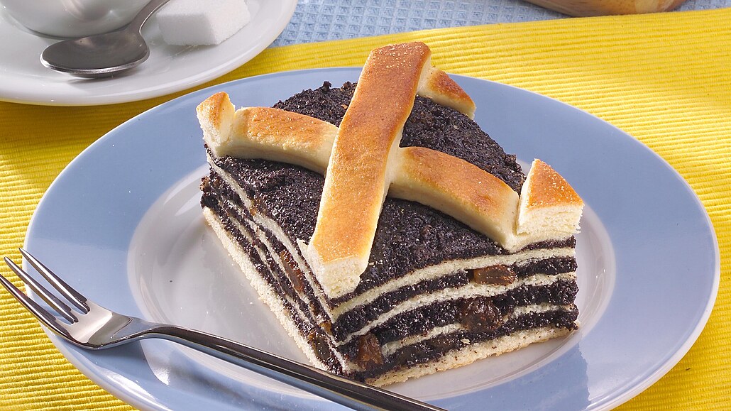 - Plech s vyšším okrajem vyložíme pečicím papírem. Na dno položíme plát těsta, potřeme ho čtvrtinou makové náplně a zakryjeme dalším plátem těsta. Postup třikrát opakujeme. Poslední plát těsta nakrájíme na proužky a navrch moučníku z nich vytvoříme mřížku. Koláč vložíme do trouby a při 200 °C ho pečeme 15 minut. Poté snížíme teplotu na 180 °C a koláč dopékáme 40 minut.