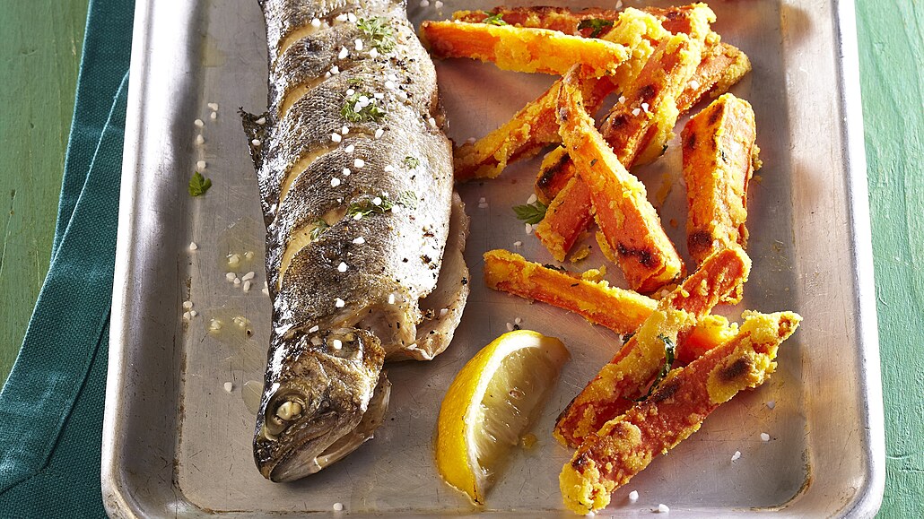 Kombinace chutí pečeného pstruha, mrkvových hranolků a estragonového dipu je naprosto skvělá.