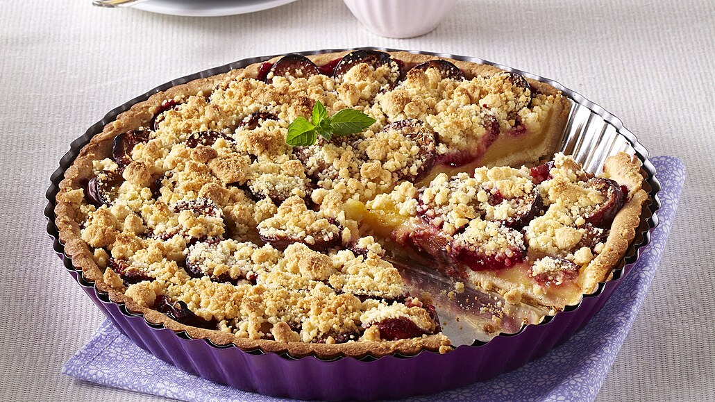 - Pudinkovou náplň poklademe půlkami švestek a posypeme drobenkou. Koláč pečeme v předehřáté troubě při 180 °C asi 30 minut.