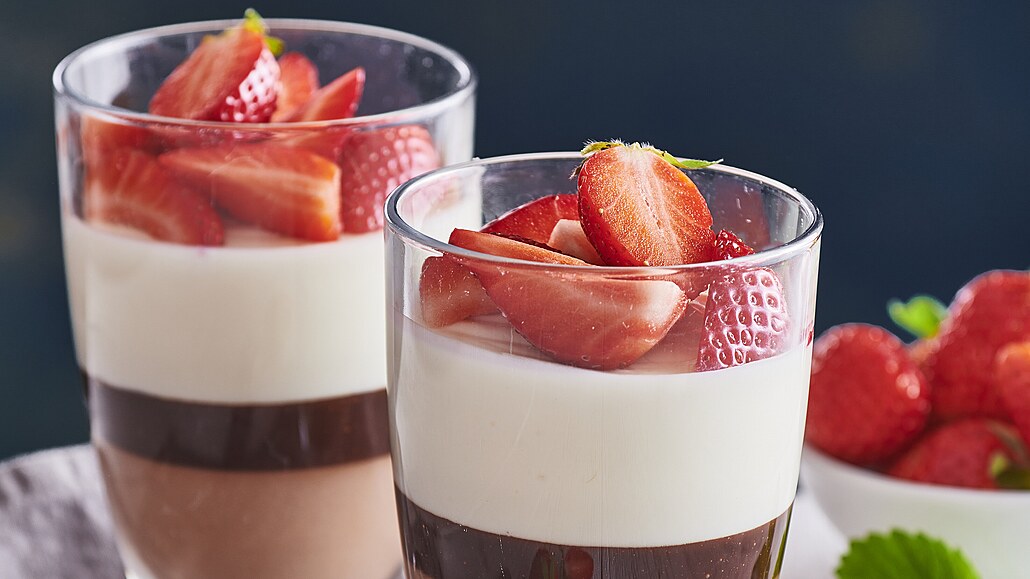 - Do pohárů naplníme nejdříve čokoládové mascarpone, zalijeme čokoládovou směsí a necháme ztuhnout v chladničce. Nakonec přidáme žloutkové mascarpone a ozdobíme nakrájenými jahodami.