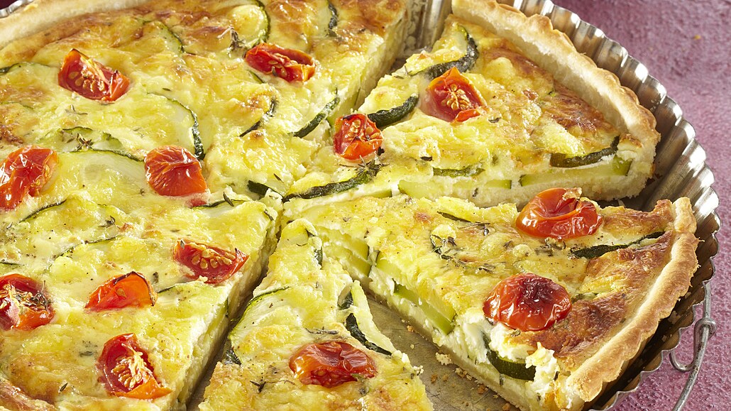 - Těsto rozválíme na kulatý plát a vyložíme jím vymaštěnou koláčovou formu. Propícháme ho vidličkou a rozetřeme na něj polovinu smetanové náplně. Pak přidáme cuketu a zbylý krém. Quiche dozdobíme překrojenými cherry rajčátky. V troubě ho při 180 °C pečeme asi 40 minut.