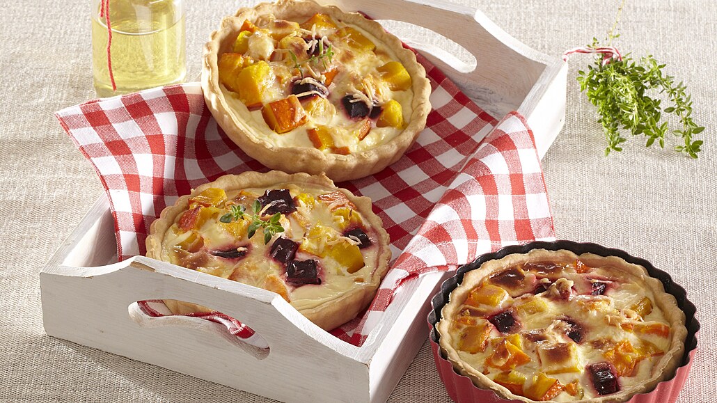 - Zeleninovou směs rozdělíme na předpečené quiche a přelijeme ji smetanou rozmíchanou s vejci a sýrem. Při 180 °C dopékáme ještě asi 30 minut.