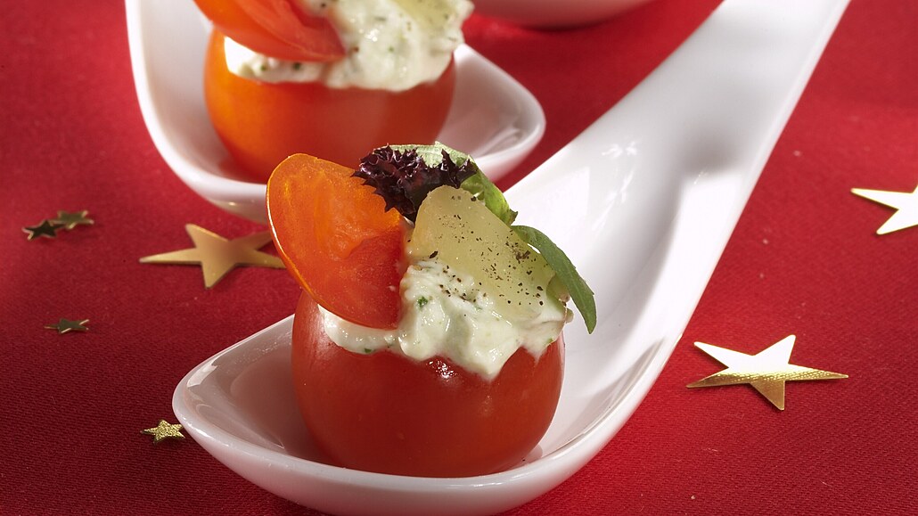 - Rajčátka rozřízneme,vydlabeme a naplníme připravenou pomazánkou. Dozdobíme kouskem zbylého tvarůžku a salátem.