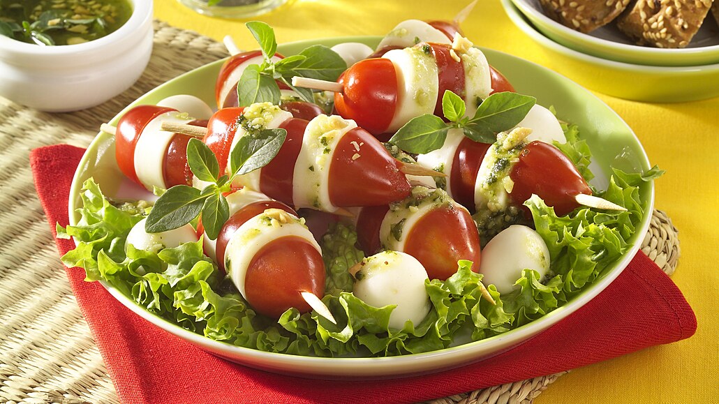 - Na napichovátka nebo kratší špejle střídavě napichujeme rajčata a plátky mozzarelly. Špízky naskládáme na talíř vyloženými opranými a okapanými listy hlávkového salátu a přidáme kuličky mozzarelly. Vychlazené pesto ještě jednou dobře promícháme a přelijeme jím rajčátkové špízky. Ozdobíme čerstvou bazalkou a podáváme.