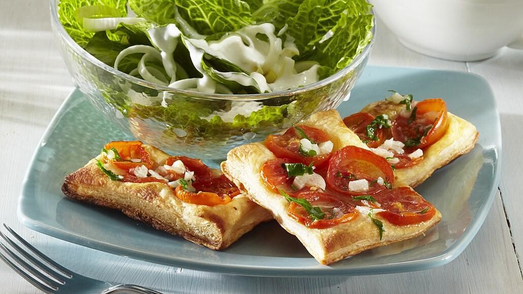 - Listové těsto rozválíme na pomoučněném vále na tenký plát a rozdělíme ho na 12 obdélníčků. Kousky těsta přeneseme na plech vyložený pečicím papírem a obložíme je rajčaty. Minipizzy v troubě předehřáté na 200 °C pečeme 12-15 minut. Pak je osolíme, opepříme a potřeme ochuceným olejem a asi na minutu vrátíme do trouby.