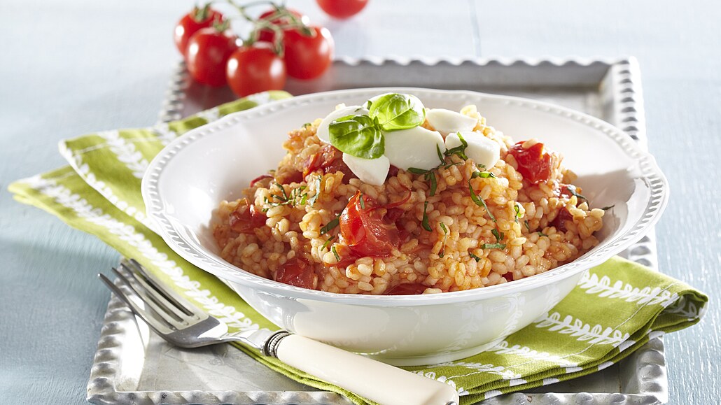 - Do rýže začneme postupně po naběračkách přilévat vroucí vývar. Další přiléváme teprve tehdy, když se předcházející dávka vstřebala či vypařila. Když ho vypotřebujeme, přilijeme rajčatovou šťávu. Rýži vaříme, dokud není na skus měkká. Ke konci v ní necháme změknout na kousky nakrájená rajčátka.