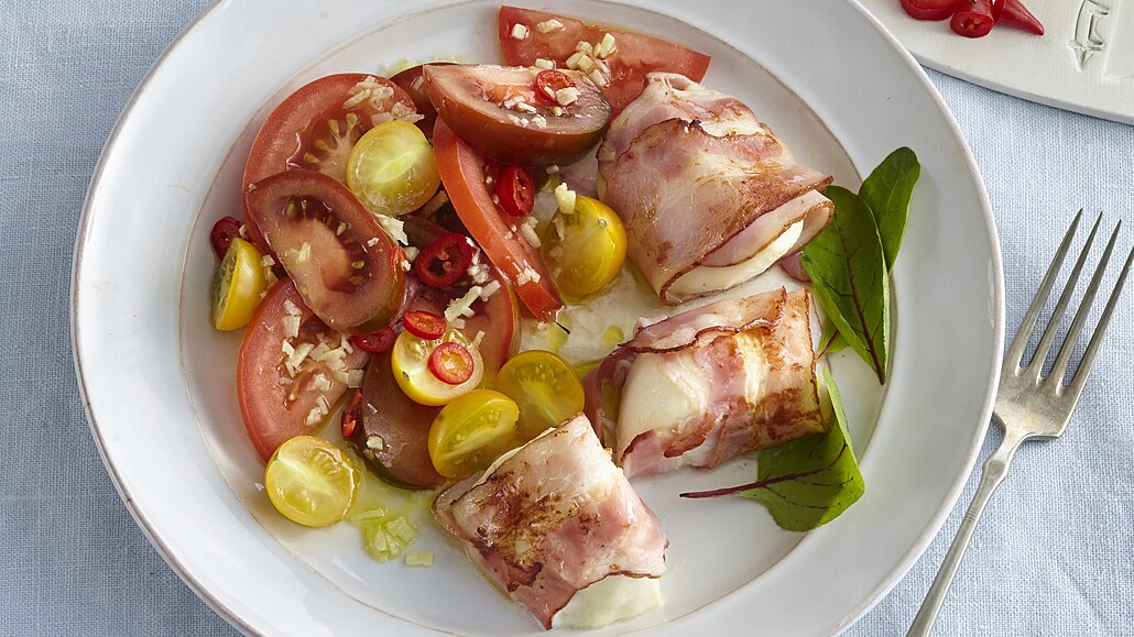 - Mozzarellu rozkrájíme na šestinky, každou zabalíme do plátku slaniny, propíchneme párátkem a zprudka opečeme na pánvi s olejem.