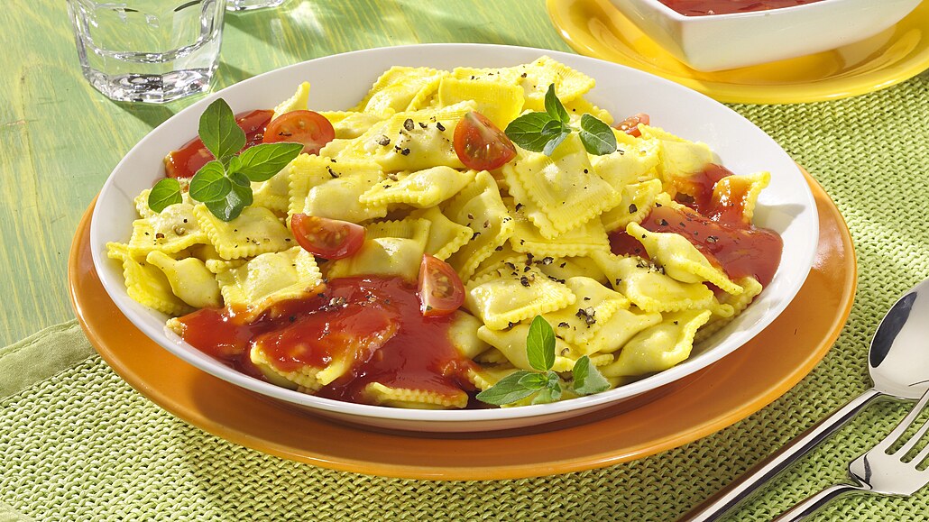 - Ravioli uvaříme v osolené vodě ?al dente?, scedíme a vrátíme do hrnce. Udržujeme je teplé. Rajčata nakrojíme do tvaru kříže a ponoříme na 1-2 minuty do vroucí vody. Ochladíme je a oloupeme.