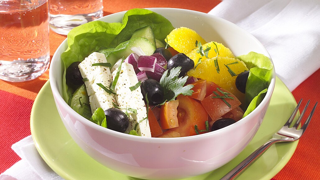 - Hlávkový salát opereme, rozebereme na listy a vyložíme jím misky, ve kterých budeme jednotlivé porce podávat. Rajčata, okurku a oloupanou cibuli nakrájíme na kostičky. Pomeranč pečlivě oloupeme a rozdělíme na měsíčky. Zeleninu a pomeranč pak rozložíme na salátové listy.