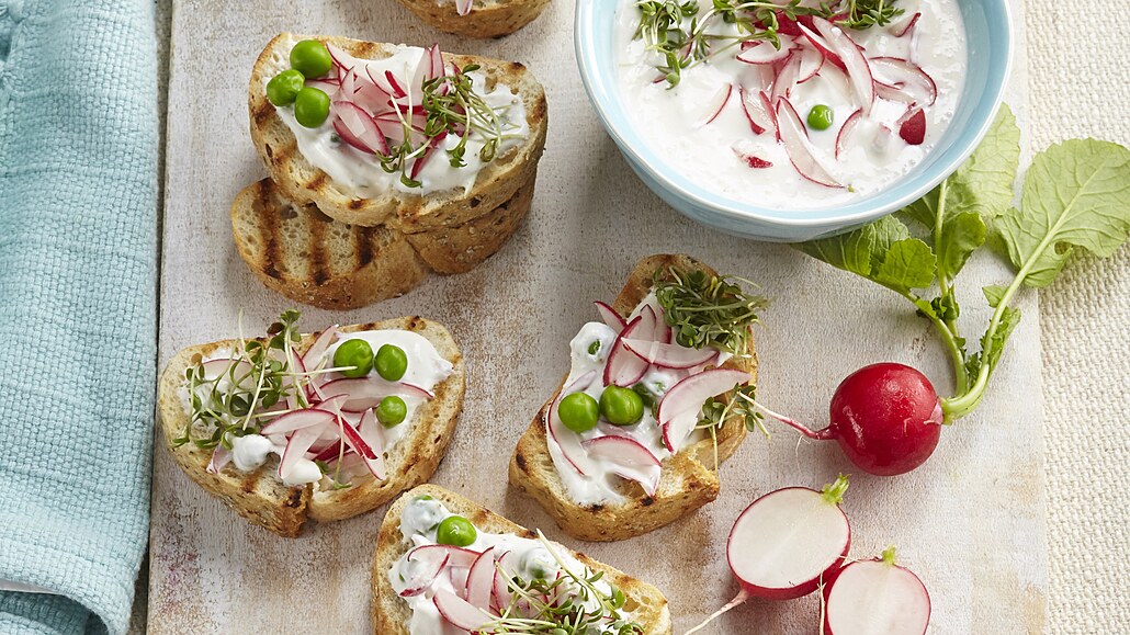 Ředkvičková pomazánka s hořčicí, řeřichou a hráškem je svěží jemně pikantní a výrazně bylinkový. Hořčice a řeřicha dodají štiplavý nádech a tvarohový základ je krémový a výrazný.