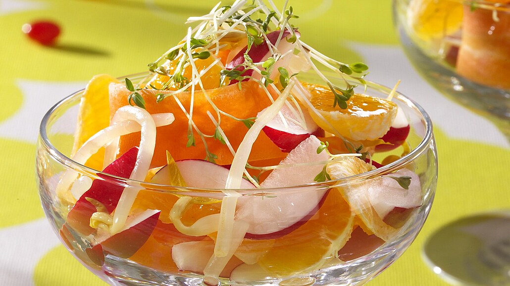 - Sherry vyšleháme metličkou s olivovým olejem a citronovou šťávou. Zálivku nalijeme na salát, necháme vychladit, pak rozdělíme do pohárů nebo misek a ozdobíme řeřichou.