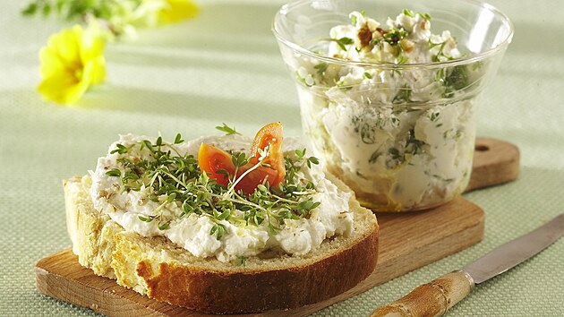 - Do krému zlehka vmícháme ořechy a nasekanou řeřichu. Pomazánku dochutíme solí a pepřem. Mažeme ji na plátky chlebíčkové veky nebo krajíčky bílého chleba. Zdobíme řeřichou, kterou jsme si nechali stranou, a rajčátky.