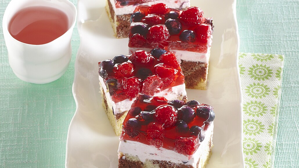 - Po ztuhnutí na povrch rozložíme maliny a borůvky. Dortové želé připravíme podle návodu na obalu a ovoce zalijeme. Necháme ztuhnout a pak nakrájíme na porce.