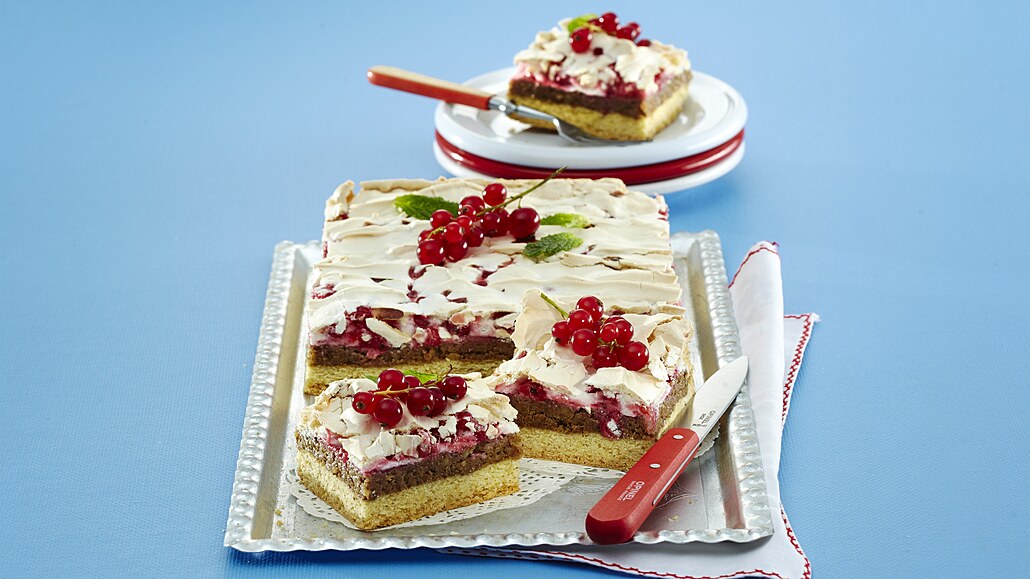 - Bílky vyšleháme s krupicovým cukrem a citronovou šťávou na pevný sníh. Pak lehce vmícháme moučkový cukr a očištěné kuličky rybízu. Sníh s rybízem rozetřeme na zapečený koláč a dopékáme při 160 °C asi 15 minut. Necháme vychladnout a nakrájíme na kousky.