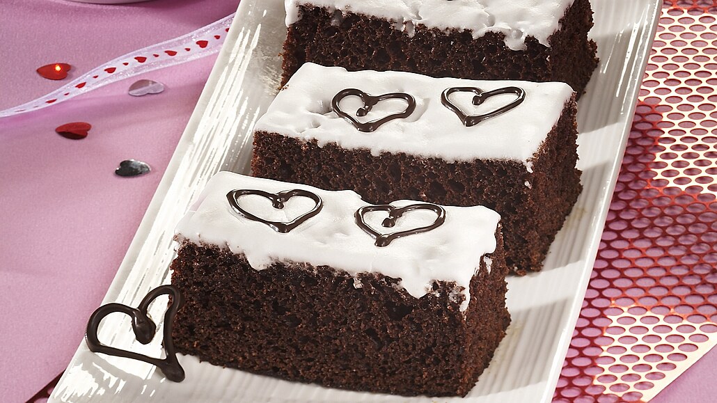 - Podle návodu na obalu si připravíme čokoládovou polevu. Do mikrotenového sáčku uděláme malou dírku a naplníme ho polevou. Moučník nakrájíme na kousky. Jednotlivé řezy ozdobíme čokoládovou polevou.