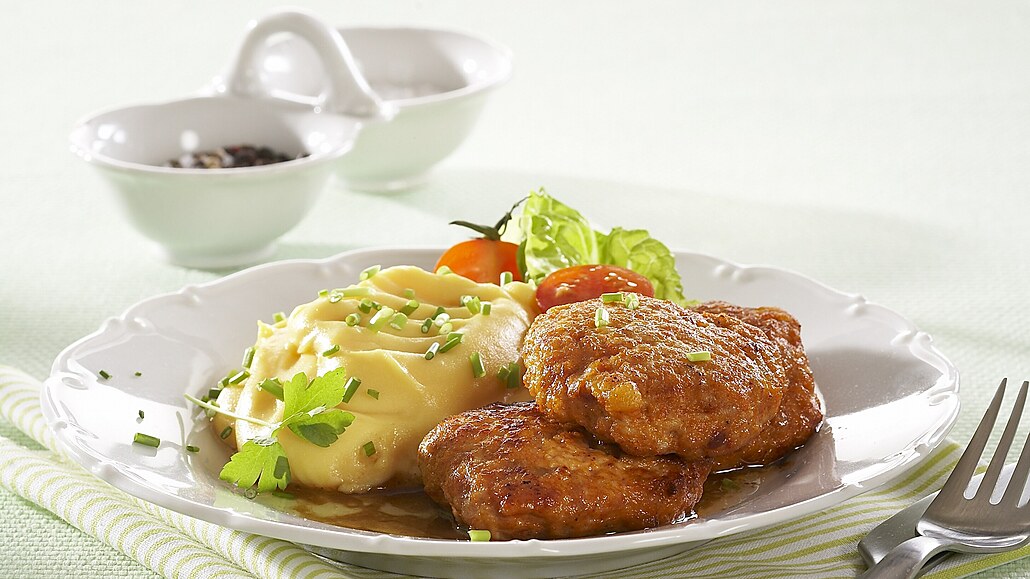 - Řízky zalijeme pivem a necháme asi 10 -15 minut dusit. Během dušení je obracíme. Hotové řízečky podáváme s bramborovou kaší, zdobíme zeleninou a pažitkou.