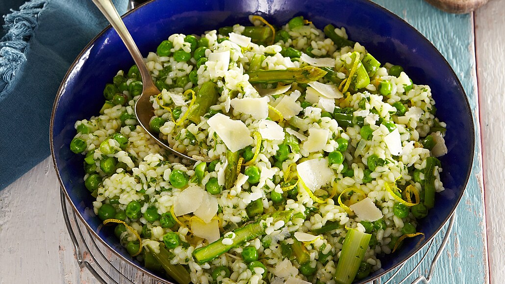 - Chřest oloupeme a v osolené vodě ho krátce povaříme. Poté ho dáme do studené vody, necháme zchladnout a nakrájíme jej na menší kousky. Chřest vložíme do rizota společně s hráškem, krátce povaříme, promícháme a dle chuti osolíme i opepříme.