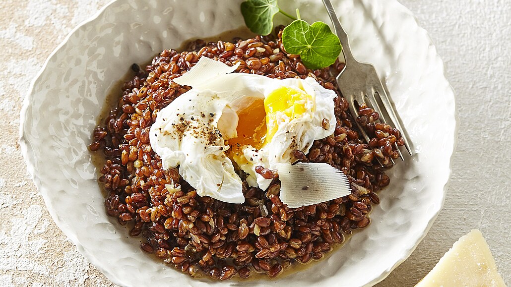 - Na rozpáleném olivovém oleji zpěníme najemno nakrájenou cibulku s česnekem, přihodíme pšenici, přilijeme trochu vody z pšenice a přidáme nastrouhaný parmazán. Ke konci vmícháme máslo a necháme ho rozpustit. Dle potřeby můžeme přidat trochu vody. Pšenice by měla být spojena omáčkou. Nakonec dochutíme pepřem a solí.