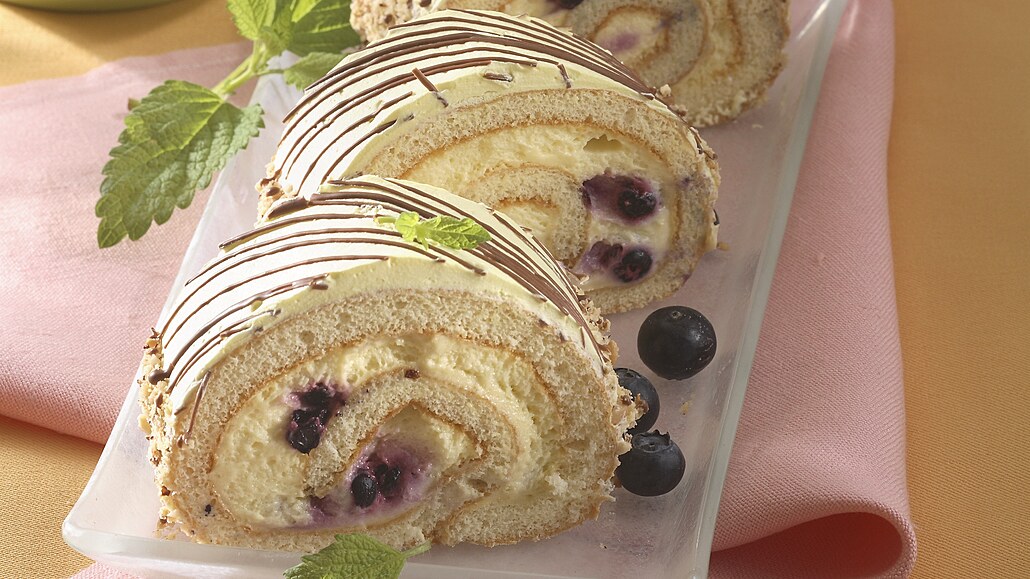 - Z vychladlého korpusu opatrně odtrhneme papír. Dvě třetiny hotového krému rozetřeme na piškotový plát a posypeme borůvkami. Pomocí utěrky stočíme do rolády a pevně zabalíme. Dáme do chladničky asi na hodinu ztuhnout.