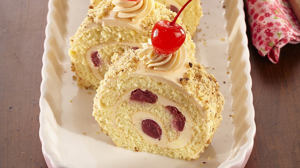 - Ztuhlou roládu vybalíme, potřeme krémem a obalíme v nastrouhaných oříškách. Po celé délce ji dozdobíme pusinkami ze zbylého krému a koktejlovými třešněmi.
