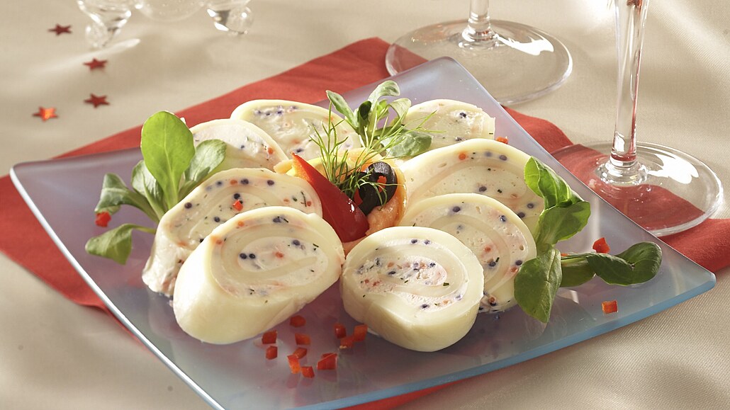 - Roládu rozbalíme, nakrájíme na plátky a zdobíme čerstvou zeleninou.