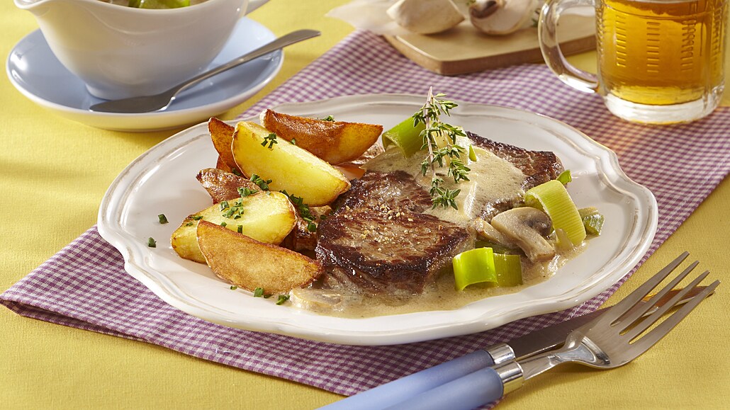 - Do omáčky vmícháme jogurt, krátce ji povaříme a dochutíme solí a pepřem. Měkké roštěnky rozdělíme na talíře, přelijeme je omáčkou a ozdobíme tymiánem. Podáváme s pečenými bramborami.