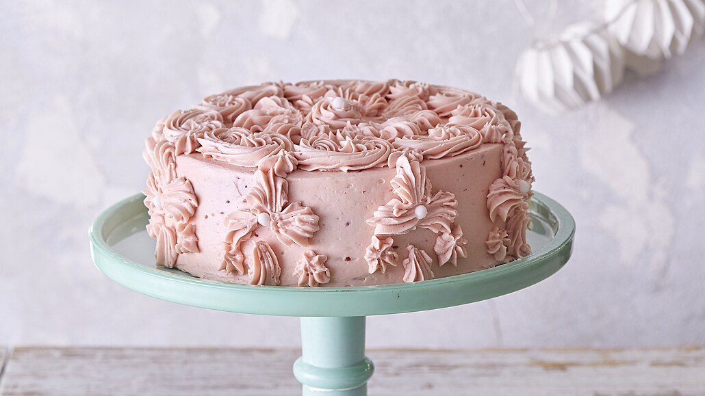 - Korpus prokrojíme podélně na tři díly a každý potřeme džemem. Slepíme je k sobě a celý dort potřeme větší částí krému. Zbylý krém přendáme do cukrářského sáčku s řezanou trubičkou a dozdobíme dort dle fantazie. Nakonec ještě do krému vmáčkneme několik cukrových perliček podáváme.