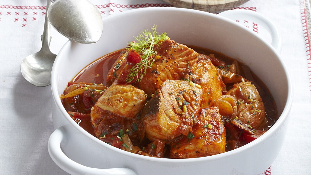 - Ryby očistíme, nakrájíme na větší kousky, přidáme k zeleninovému základu a opatrně promícháme. Po chvíli směs podlijeme bílým vínem a na mírném ohni necháme dusit.