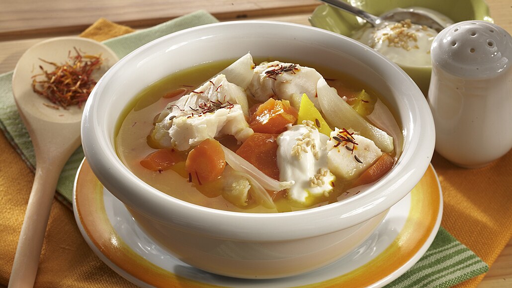 - Rybí maso omyjeme, nakrájíme na kostičky 3x3 cm velké a přidáme do hrnce. Pozvolna vaříme ještě asi 5 minut. Polévku podáváme ozdobenou jogurtem a nasucho orestovanými semínky sezamu.