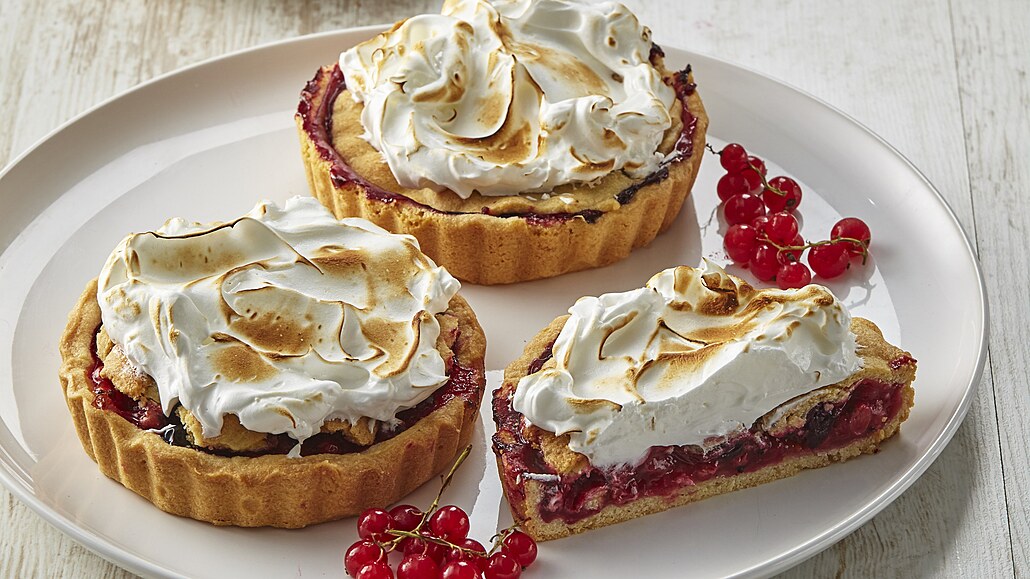 - Z bílků, šťávy a cukru vyšleháme pevný sníh. Lžící ho naneseme na upečené koláčky, rozetřeme na povrchu a flambovací pistolí sníh zapečeme. Sníh můžeme zapéct také pod rozehřátým grilem při 250 °C asi 5 minut.