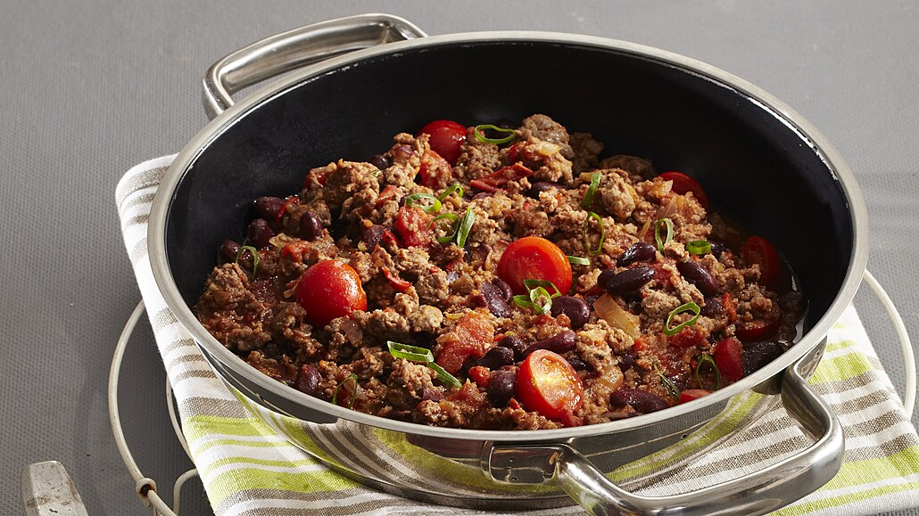 - Do pánve přidáme mleté maso. Zprudka jej orestujeme a vařečkou rozdělíme na kousíčky. Když je opečené, ochutíme ho chilli a sladkou paprikou.